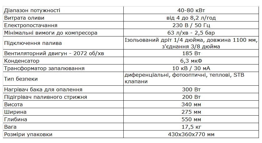 Технічні характеристики мультимасляного пальника MTM СТВ 80