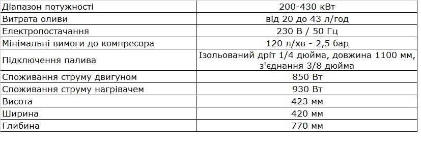 Технічні характеристики мультимасляного пальника MTM СТВ 400